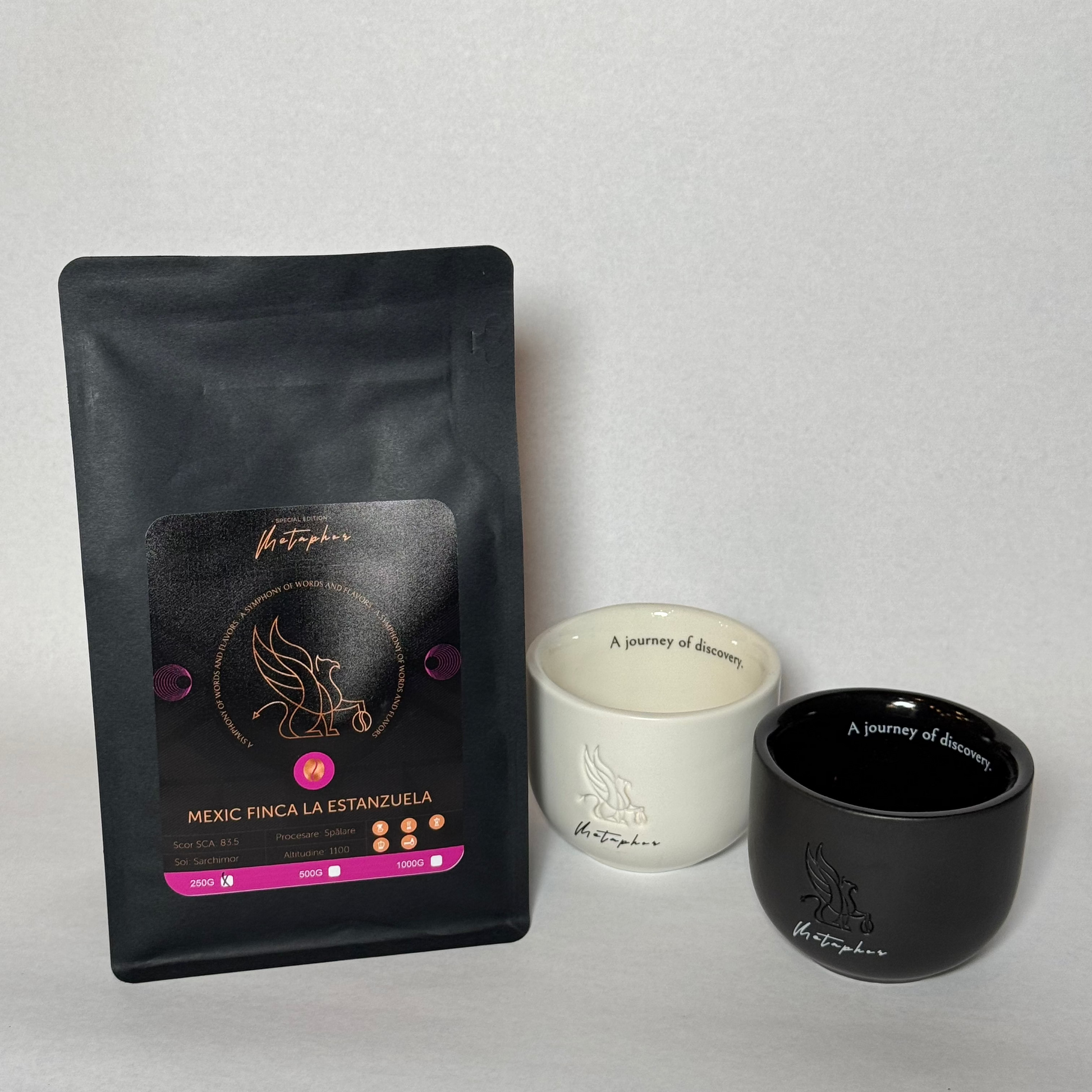 - 2 Cești Metaphor (S/M/L): cești rafinate, perfecte pentru a transforma fiecare cafea într-o poveste de neuitat.