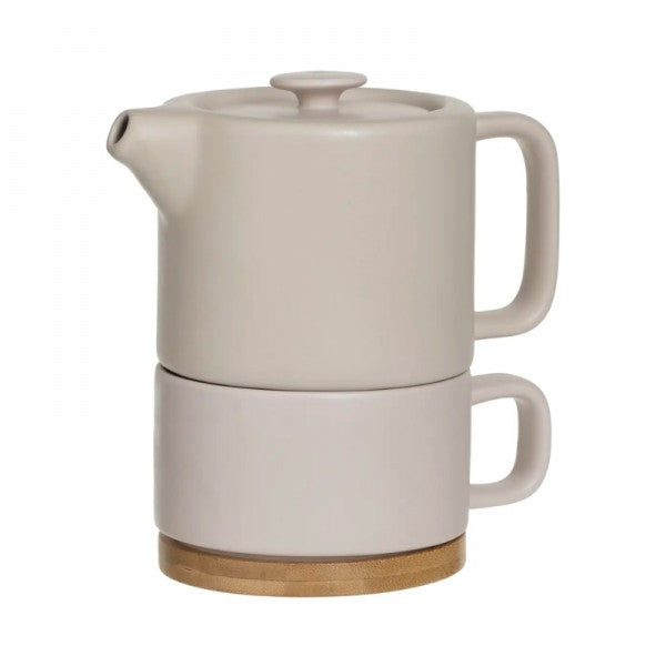 Setul este alcatuit dintr-un ceainic de 400 ml din ceramica prevazut cu capac si infuzor, o ceasca care se integreaza perfect in set si un suport din bambus potrivit pentru cele 2 produse
